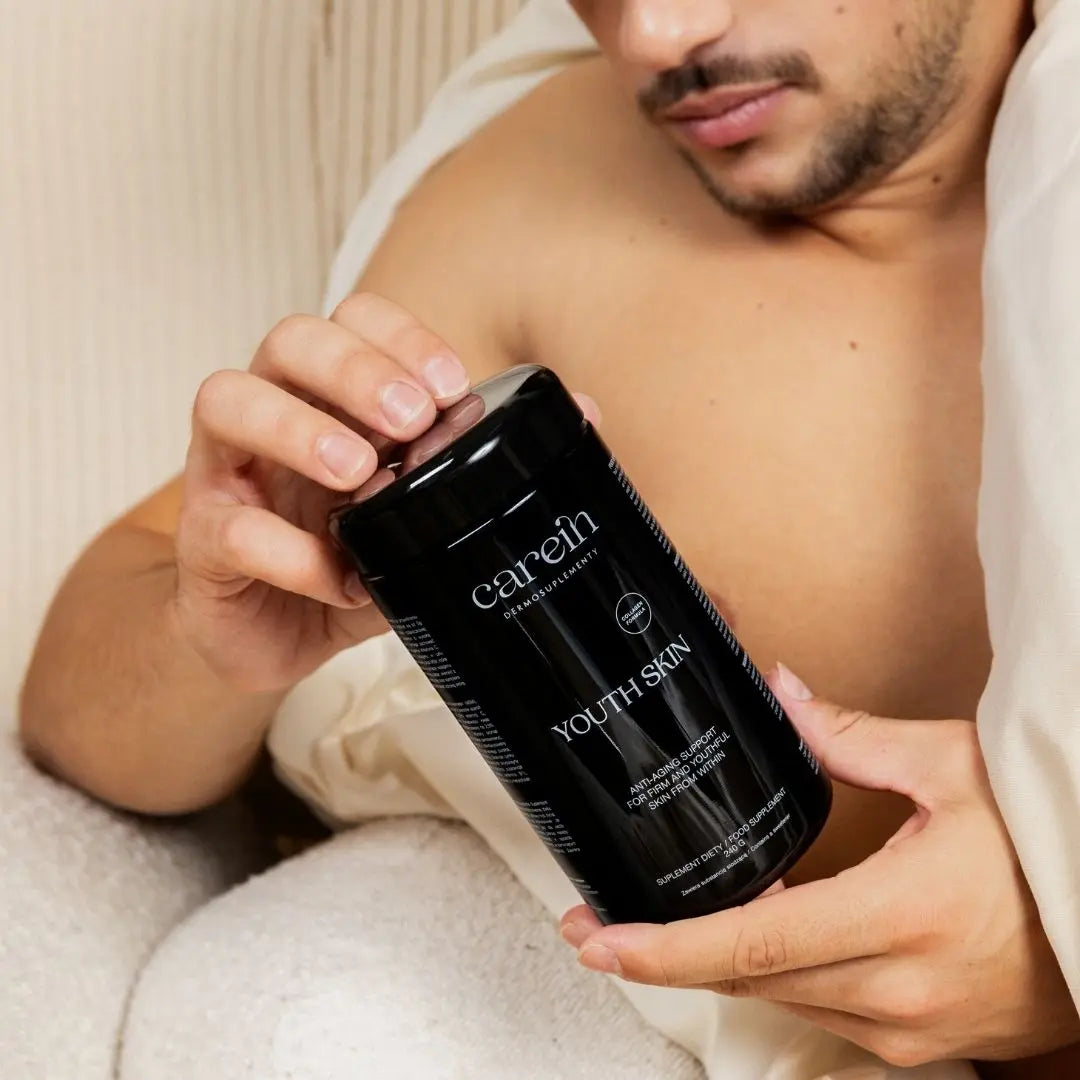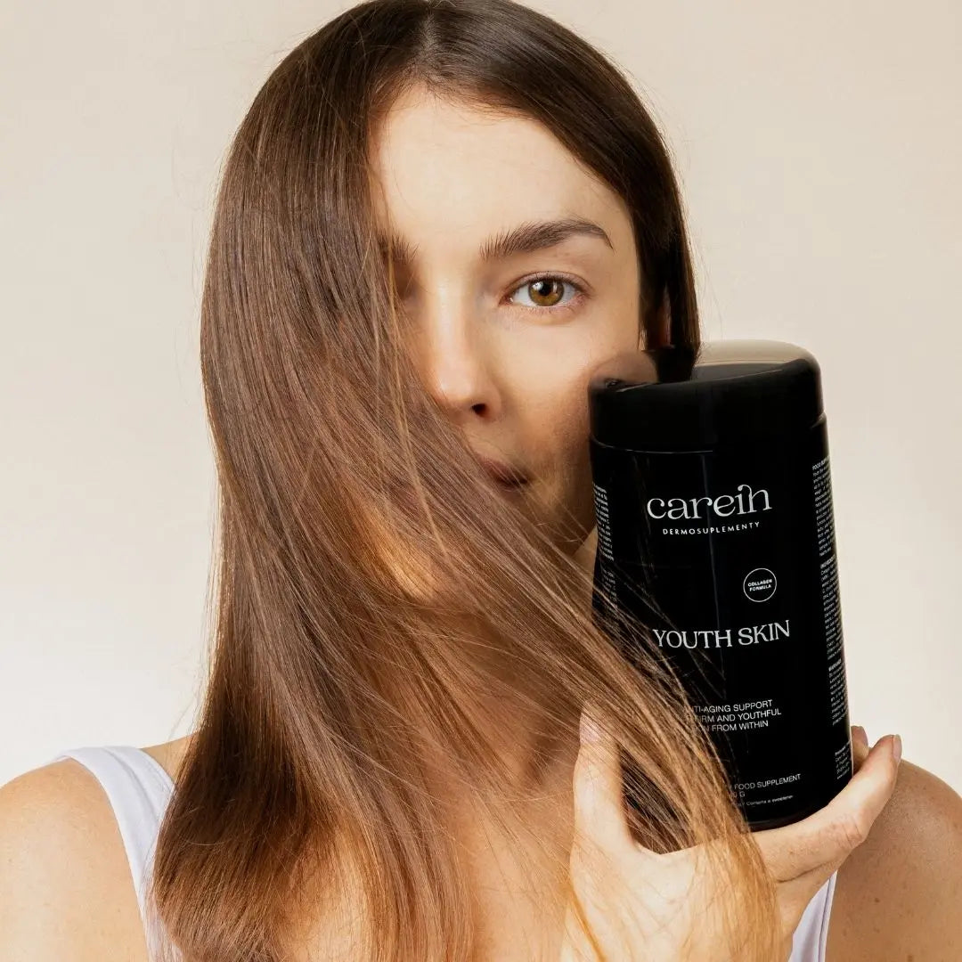 Youth Skin to Dermosuplement ukierunkowany na zmniejszenie objawów starzenia się skóry. Wykorzystaliśmy w nim kolagen – podstawowy fundament skóry wraz z witaminą C i MSM, które są niezbędne do jego skutecznej odbudowy. W preparacie jest aż 20 witamin i ekstraktów roślinnych, które zapewniają szybszą regenerację, poprawiają jędrność, elastyczność i nawodnienie skóry.